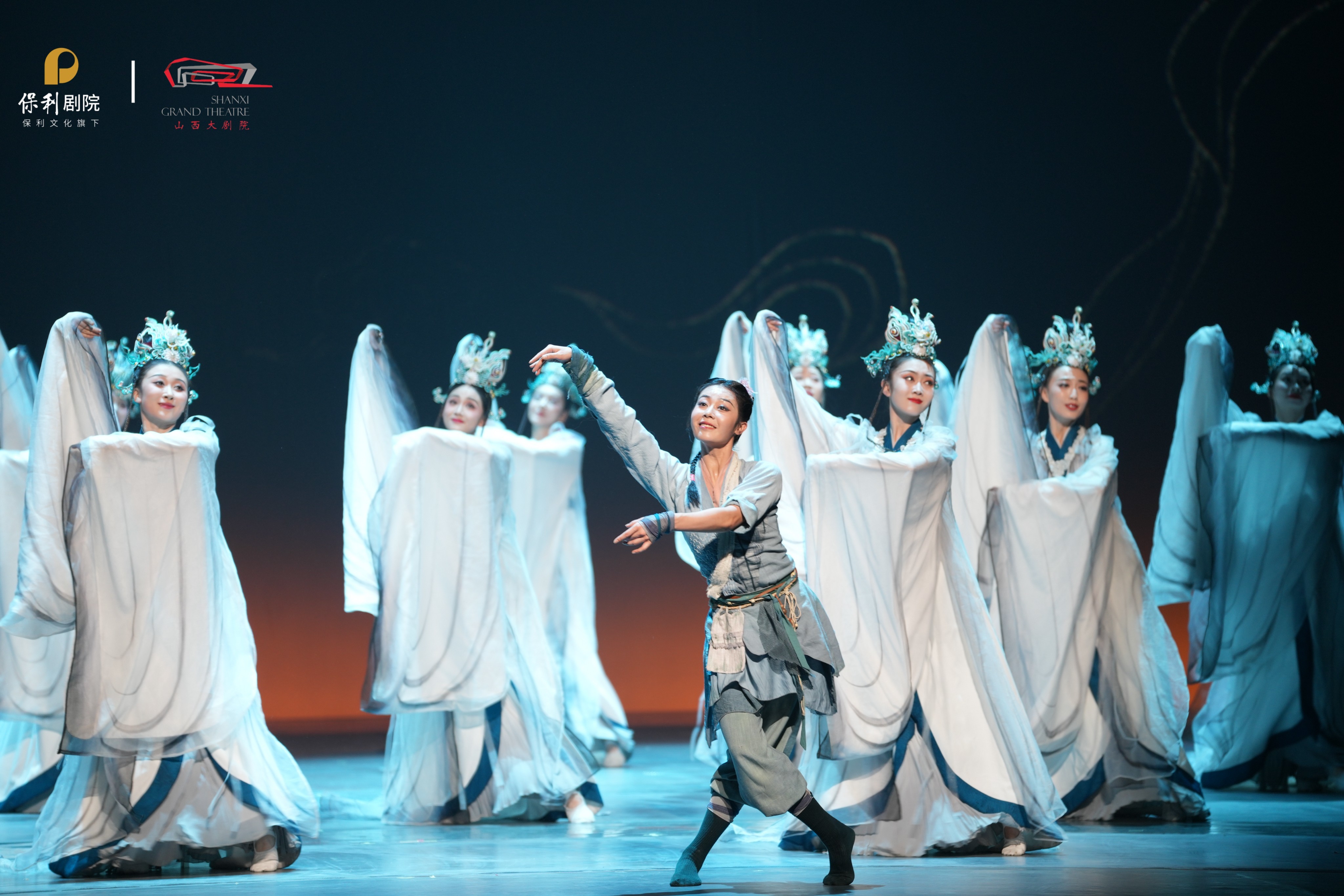舞台上,壁画中的神仙翩然“走”下墙壁,古建藻井通过舞者身体的层叠交旋“活”了起来,失传的孔雀蓝釉在光影中重现光华……