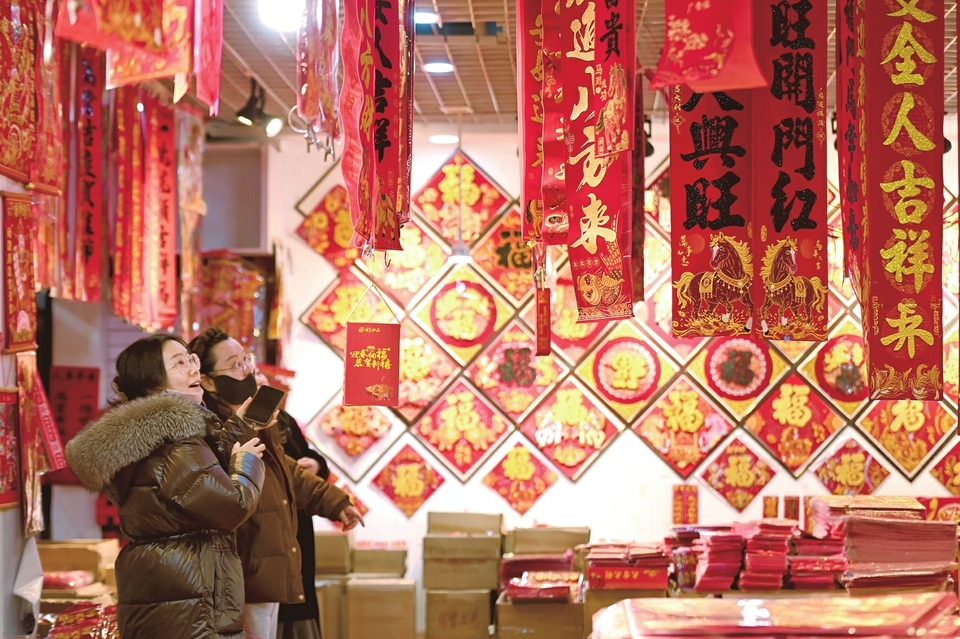 1月6日,太原市尖草坪区小商品批发市场内年味渐浓,春联、福字、生肖饰品等年货琳琅满目。图为市民正在进行选购。(记者赵夏雨摄)