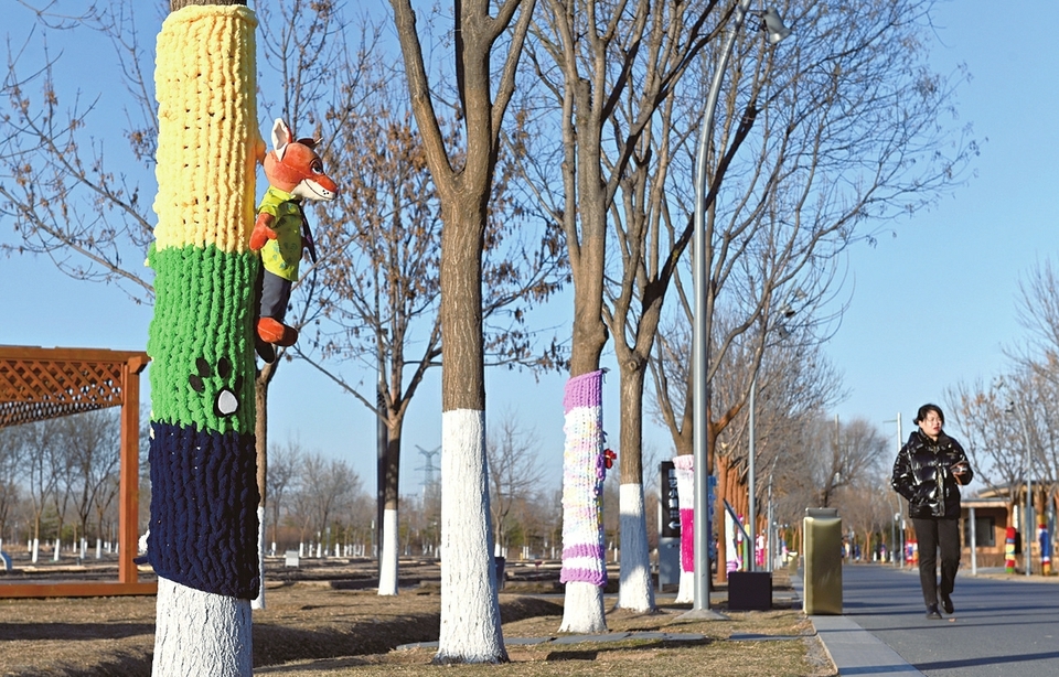 1月8日,太原植物园内,部分树木“穿”上了手工编织的“毛衣”,活力满满的多巴胺配色为冬日增添了别样生机,成为园区内一道亮丽的风景线,吸引游人拍照留念。(王若渊摄)